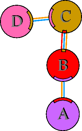 Interacting chains are joined by coloured lines, each representing
