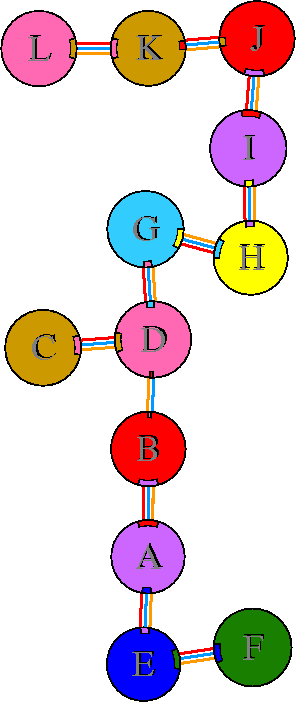 Interacting chains are joined by coloured lines, each representing