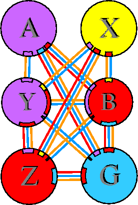 Interacting chains are joined by coloured lines, each representing