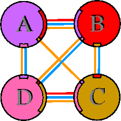 Interacting chains are joined by coloured lines, each representing