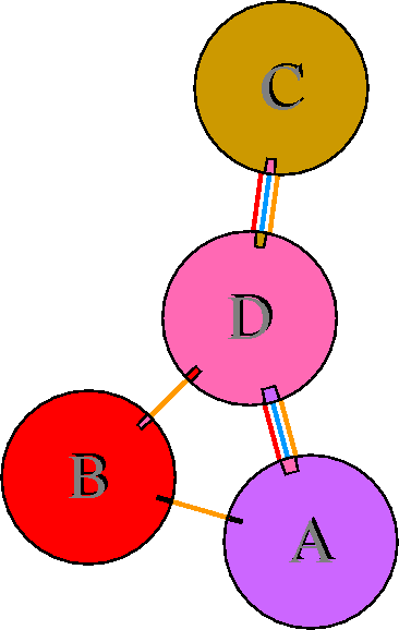 Interacting chains are joined by coloured lines, each representing