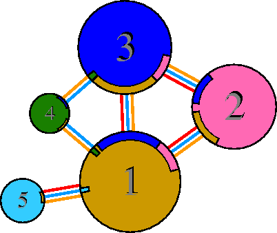 Interacting chains are joined by coloured lines, each representing