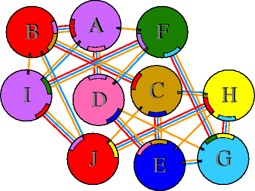 Interacting chains are joined by coloured lines, each representing