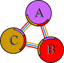 Interacting chains are joined by coloured lines, each representing