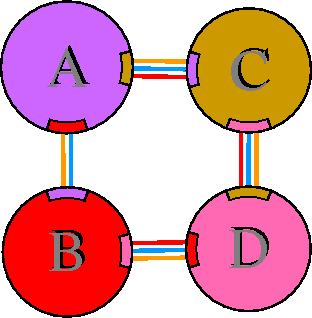 Interacting chains are joined by coloured lines, each representing