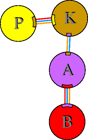 Interacting chains are joined by coloured lines, each representing