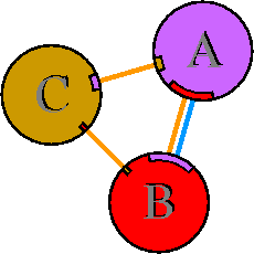 Interacting chains are joined by coloured lines, each representing