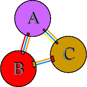 Interacting chains are joined by coloured lines, each representing
