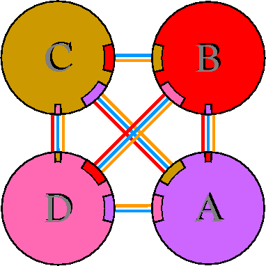 Interacting chains are joined by coloured lines, each representing