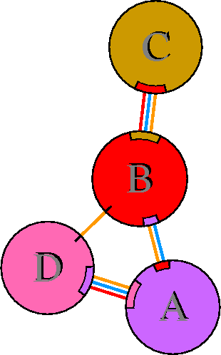 Interacting chains are joined by coloured lines, each representing