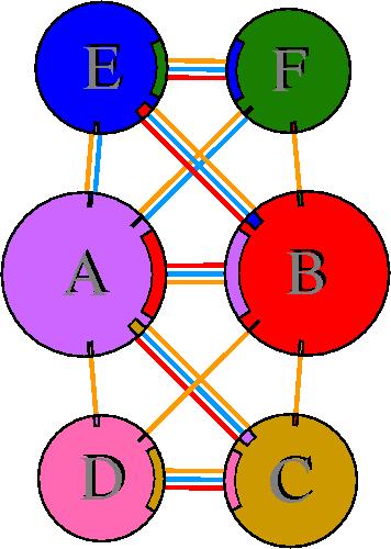 Interacting chains are joined by coloured lines, each representing
