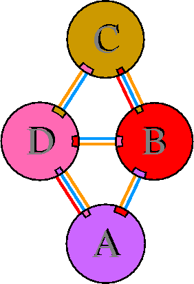 Interacting chains are joined by coloured lines, each representing