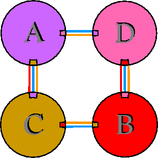 Interacting chains are joined by coloured lines, each representing