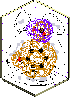 In the first plot of each pair the sidechains are shown as ball-and-stick models; in the second plot the van der Waals surfaces are superimposed as wire-cage contours. The reference sidechain is shown in purple while the cluster representative is shown in orange. Click on the first plot to get a magnified view, including the other cluster members.