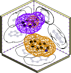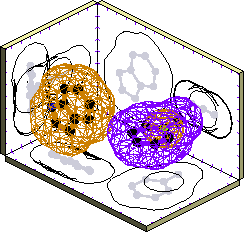 In the first plot of each pair the sidechains are shown as ball-and-stick models; in the second plot the van der Waals surfaces are superimposed as wire-cage contours. The reference sidechain is shown in purple while the cluster representative is shown in orange. Click on the first plot to get a magnified view, including the other cluster members.