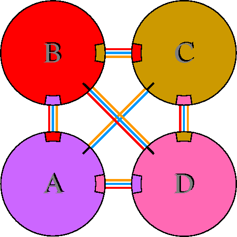 Interacting chains are joined by coloured lines, each representing
