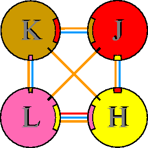 Interacting chains are joined by coloured lines, each representing