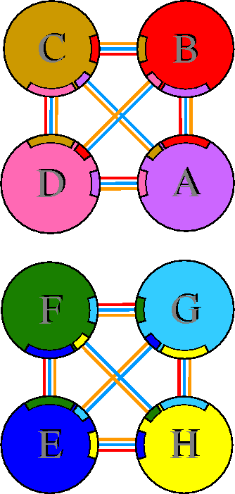 Interacting chains are joined by coloured lines, each representing