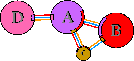 Interacting chains are joined by coloured lines, each representing