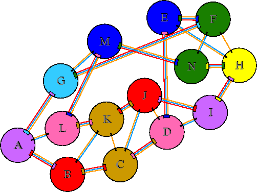Interacting chains are joined by coloured lines, each representing