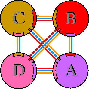 Interacting chains are joined by coloured lines, each representing