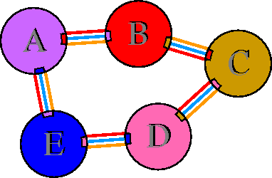 Interacting chains are joined by coloured lines, each representing