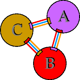 Interacting chains are joined by coloured lines, each representing