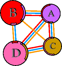 Interacting chains are joined by coloured lines, each representing