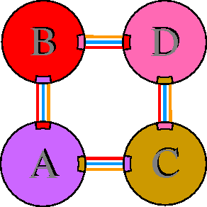 Interacting chains are joined by coloured lines, each representing