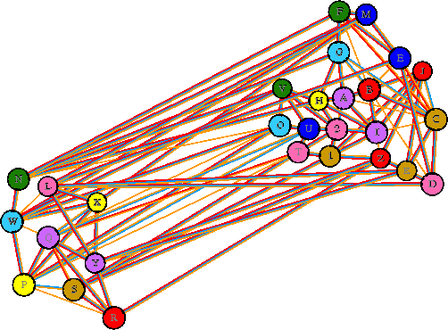 Interacting chains are joined by coloured lines, each representing