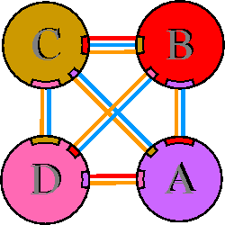 Interacting chains are joined by coloured lines, each representing