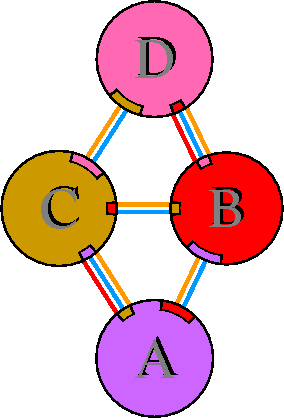 Interacting chains are joined by coloured lines, each representing