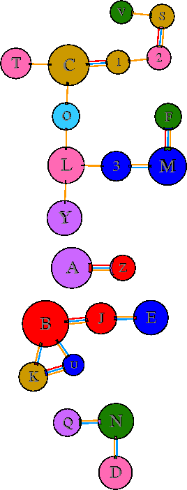 Interacting chains are joined by coloured lines, each representing