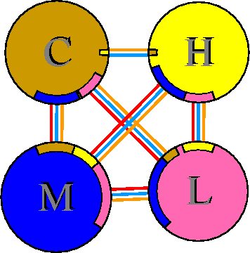 Interacting chains are joined by coloured lines, each representing