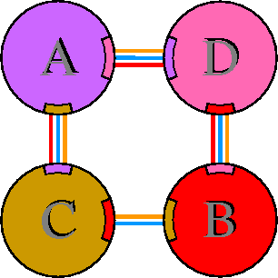Interacting chains are joined by coloured lines, each representing