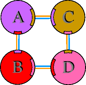 Interacting chains are joined by coloured lines, each representing