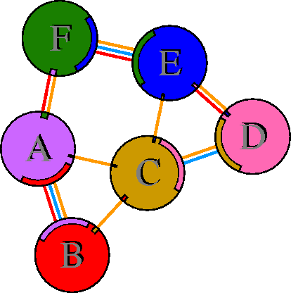 Interacting chains are joined by coloured lines, each representing