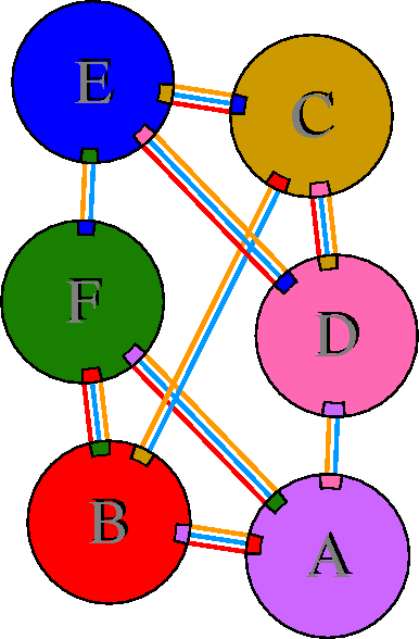 Interacting chains are joined by coloured lines, each representing