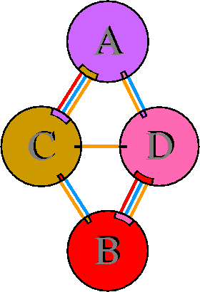 Interacting chains are joined by coloured lines, each representing