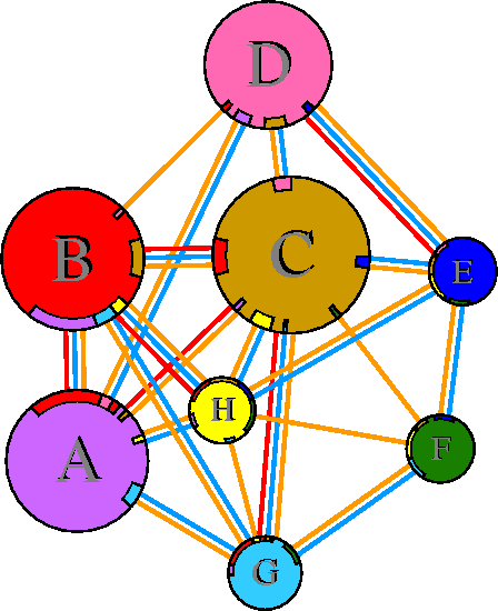 Interacting chains are joined by coloured lines, each representing