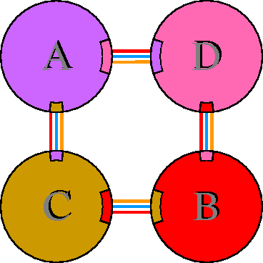 Interacting chains are joined by coloured lines, each representing