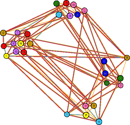 Interacting chains are joined by coloured lines, each representing