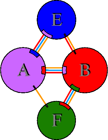 Interacting chains are joined by coloured lines, each representing