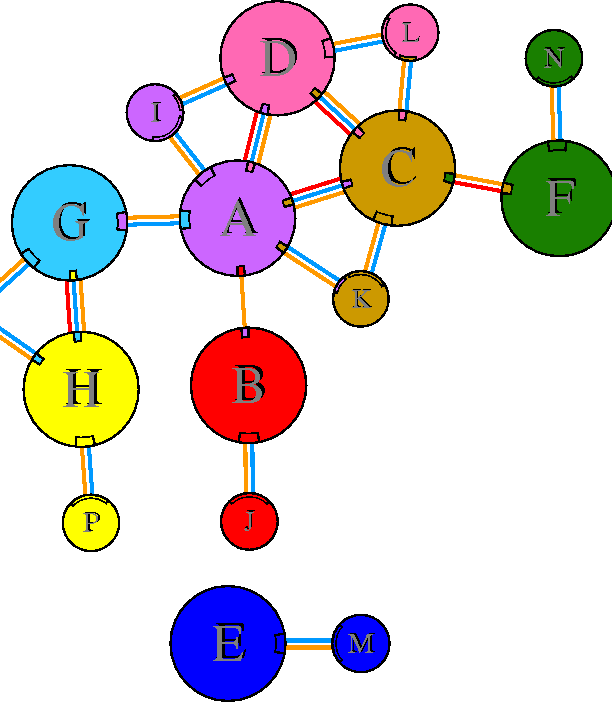 Interacting chains are joined by coloured lines, each representing
