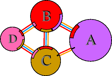 Interacting chains are joined by coloured lines, each representing