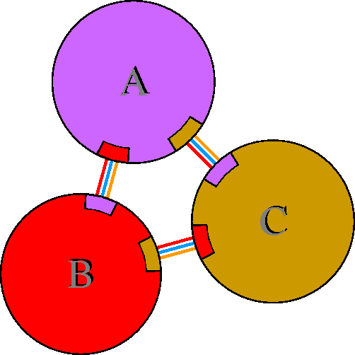Interacting chains are joined by coloured lines, each representing