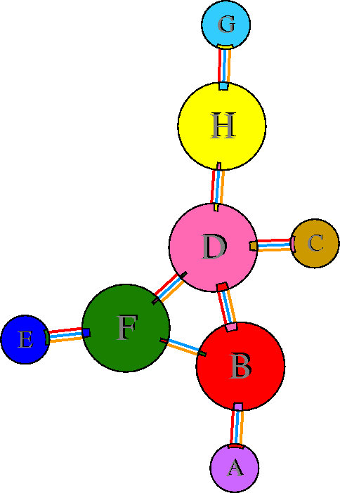Interacting chains are joined by coloured lines, each representing