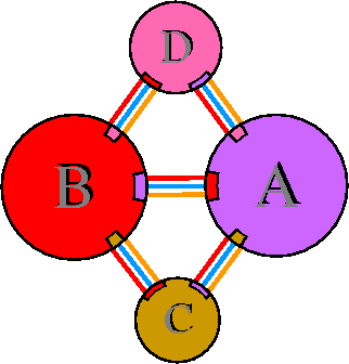 Interacting chains are joined by coloured lines, each representing