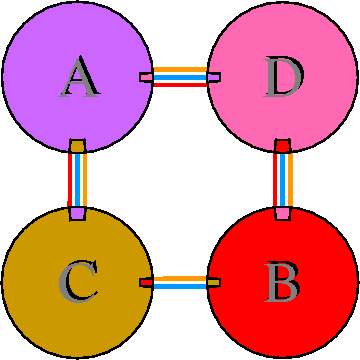 Interacting chains are joined by coloured lines, each representing