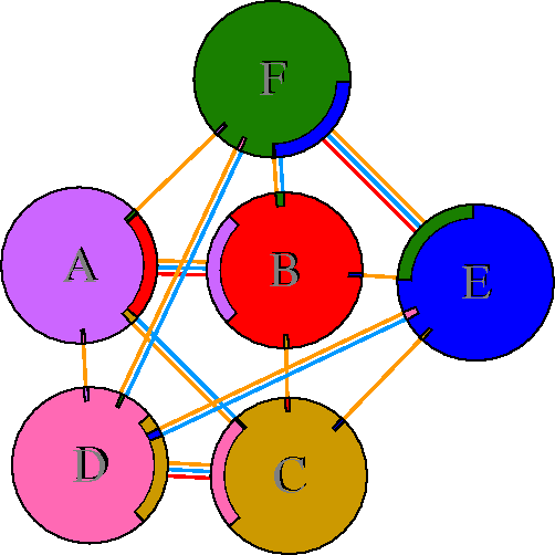Interacting chains are joined by coloured lines, each representing